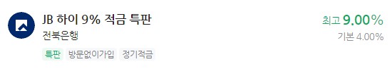 은행 이자 높은 적금 추천 - JB 하이 9% 적금 특판 전북은행